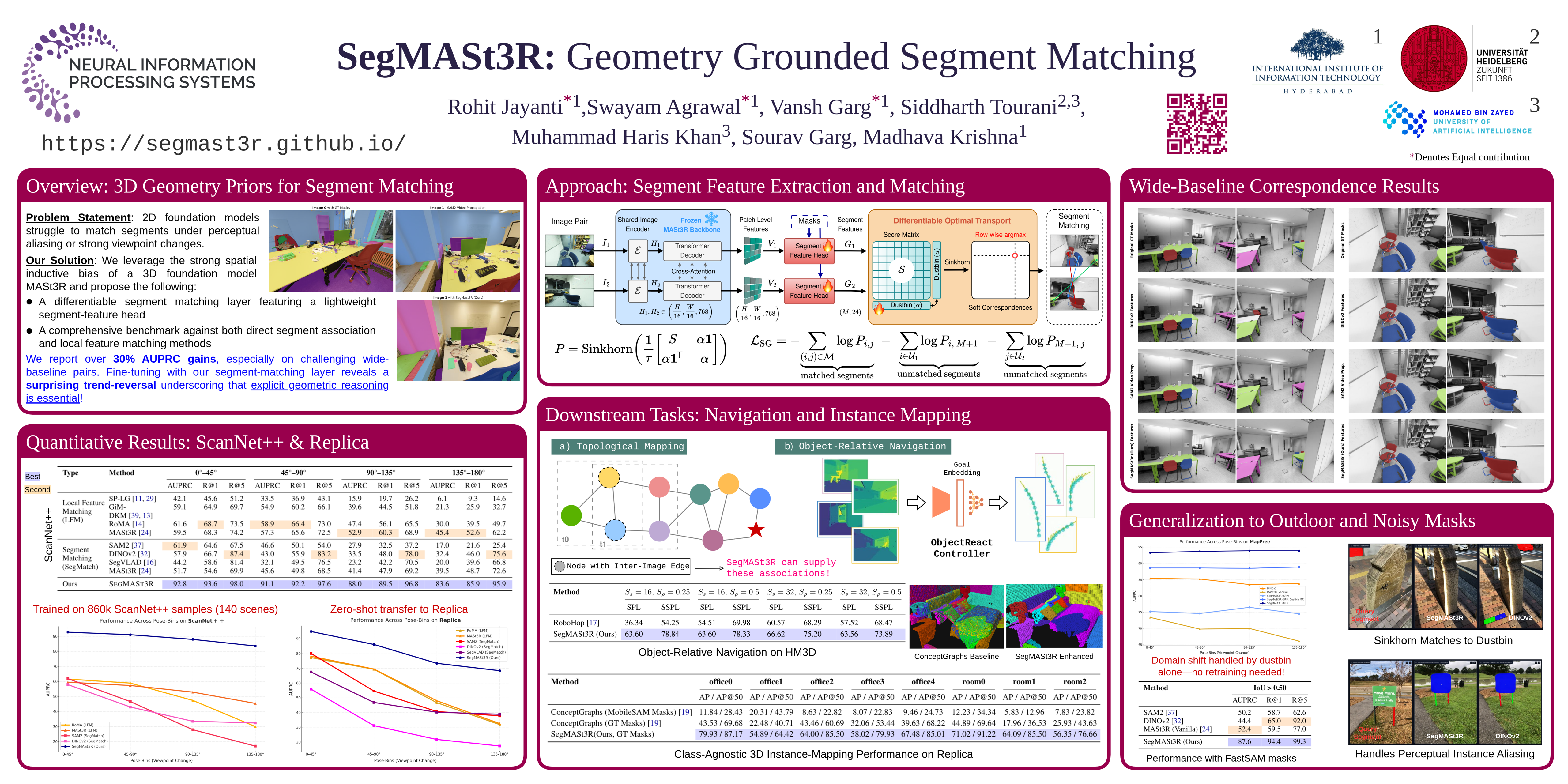 | SegMASt3R (Ours) | 95.0 | 96.0 | 98.6 | 86.2 | 91.2 | 96.4 | 73.4 | 85.2 | 95.7 | 68.4 | 83.8 | 94.8 |